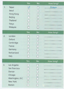 Listening Unit 18 Vacations Listening 2 Trang Nguyen 10/12/2020 15 lượt xem 0 bình luận Listening 2 Task 1. People are talking about their vacation plans. where will they go? listen and check yes or no. https://tienganhtriduc.com/wp-content/uploads/2020/12/08-Unit-18.mp3 1 Taipei Yes No Seoul Yes No Hong Kong Yes No Beijing Yes No Thailand Yes No Tokyo Yes No Malaysia Yes No 2 London Yes No Oxford Yes No Cambridge Yes No France Yes No Germany Yes No Switzerland Yes No Italy Yes No 3 Los Angeles Yes No San Francisco Yes No Denver Yes No Chicago Yes No Washington, D.C. Yes No New York Yes No Boston Yes No Task 2 Listen again. How long will they in each please? Write the correct answers in the charts. https://tienganhtriduc.com/wp-content/uploads/2020/12/08-Unit-18.mp3 Taipei 3 days 2 days 5 days Seoul 1 week 2 days 3 days Hong Kong 2 days 3 days 5 days Thailand 3 days 2 days 5 days London 5 days 1 week 1 day Oxford 2 days 2 week 5 days Switzerland 2 days 5 days 3 days Italy 5 days 2 days 3 days Los Angeles 3 days 2 days 5 days Denver 1 day 2 days 1 week Washington, D.C 1 week 2 days 1 day New York 1 week 3 days 5 days Loading … Chia sẻ Email a link to a friend (Opens in new window) Email Print (Opens in new window) Print Related 🏷 Tags: IELTS Listening Luyện nghe Chia sẻ: Facebook Twitter Copy link