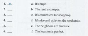 Listening Unit 7 Housing Listening 2 Trang Nguyen 20/11/2020 15 lượt xem 0 bình luận Listening 2. Task 1. people are talking questions about where thay live. what do the people dislike about each place? listen and circle the correct answer. https://tienganhtriduc.com/wp-content/uploads/2020/11/33-Unit-7.mp3 1 the neighbors the noise the size 2 the location the condition the rent 3 the location the noise the size 4 the size the location the rent 5 the size the condition the noise 6 the neighbors the condition the rent Task 2 Listen again. what do the people like about each place? write the correct letter. https://tienganhtriduc.com/wp-content/uploads/2020/11/33-Unit-7.mp3 1-e, 2-c, 3-d, 4-f, 5-a, 6-b 1-e, 2-b, 3-c, 4-f, 5-a, 6-d 1-e, 2-b, 3-d, 4-a, 5-f, 6-c Loading … Chia sẻ Email a link to a friend (Opens in new window) Email Print (Opens in new window) Print Related 🏷 Tags: IELTS Listening Luyện nghe Chia sẻ: Facebook Twitter Copy link